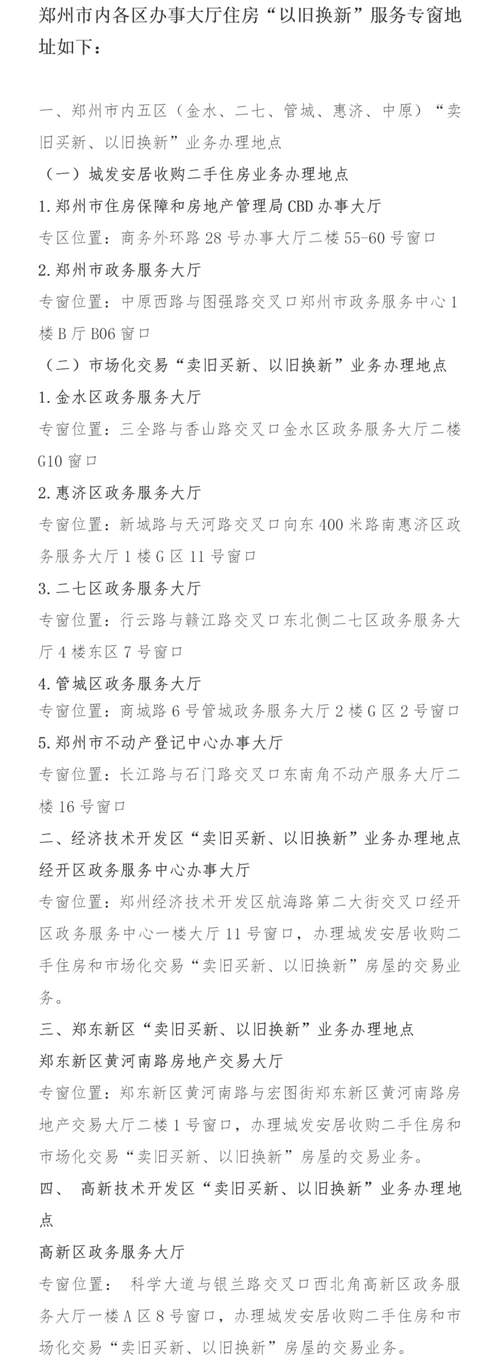 7月16日,記者從鄭州市房管局獲悉,為促進該市房地產(chǎn)市場“賣舊買新、以舊換新”政策進一步落實,鄭州市房管局會同稅務、不動產(chǎn)登記等部門,認真梳理工作流程、全面開設(shè)服務專區(qū),全力推進住房“以舊換新”工作。目前,鄭州市內(nèi)8區(qū)10個辦事大廳均開設(shè)“以舊換新”服務專窗,辦理相關(guān)業(yè)務可享受“專人專窗”的服務。