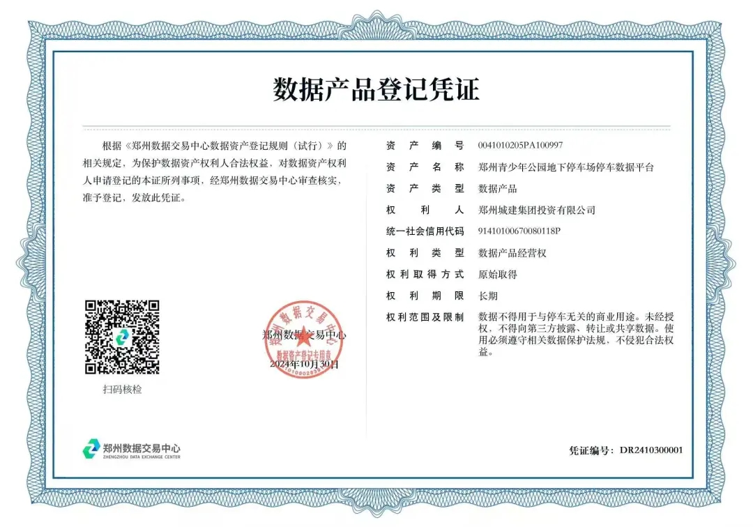 10月30日,城發(fā)集團下屬子公司鄭州城建集團投資有限公司(以下簡稱“城建集團”)在鄭州數據交易中心成功完成了“鄭州青少年公園地下停車場停車數據平臺”數據產品的資產登記,喜獲數據產品登記憑證,成為鄭州市首家將停車數據資產入表的國有企業(yè)。