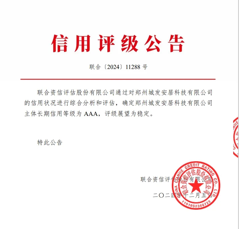 12月5日,鄭州城市發(fā)展集團有限公司下屬子公司鄭州城發(fā)安居科技有限公司(以下簡稱安居科技)順利取得AAA主體信用評級,評級展望為“穩(wěn)定”,成功邁入國內企業(yè)信用等級第一梯隊。