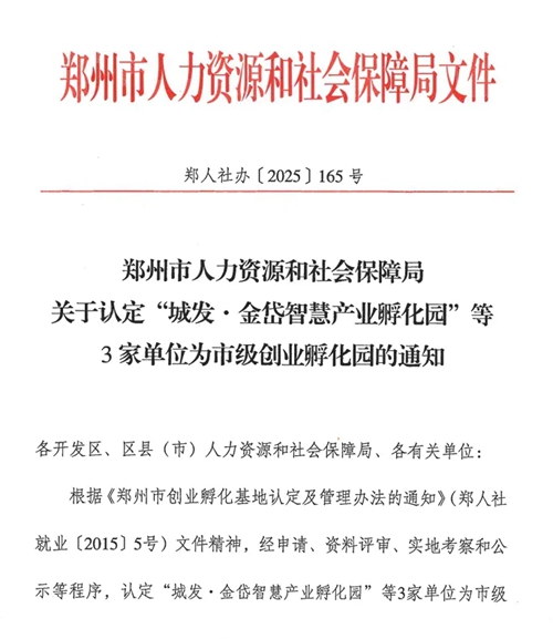近日,鄭州市人力資源和社會保障局發(fā)布關(guān)于認(rèn)定“城發(fā)·金岱智慧產(chǎn)業(yè)孵化園”等3家單位為市級創(chuàng)業(yè)孵化園的通知。根據(jù)《鄭州市創(chuàng)業(yè)孵化基地及管理辦法的通知》(鄭人社就業(yè)〔2015〕5號)文件精神,經(jīng)申請、資料評審、實(shí)地考察和公示等程序,認(rèn)定“城發(fā)·金岱智慧產(chǎn)業(yè)孵化園”等3家單位為市級創(chuàng)業(yè)孵化園,并頒發(fā)鄭州市創(chuàng)業(yè)孵化園榮譽(yù)牌匾。