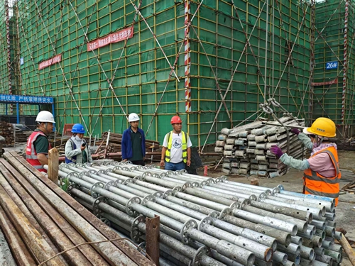 來到3樓頂板上方,工人們正搭建防護(hù)網(wǎng)。“他們是這個工作面的開荒者,危險系數(shù)最大。”葉劉杰說,只有防護(hù)網(wǎng)搭建完畢,木工、鋼筋工等不同班組才能陸續(xù)入場施工。仔細(xì)查看每道工序,并對當(dāng)班工人叮囑一番注意事項(xiàng)后,葉劉杰才放心離開。