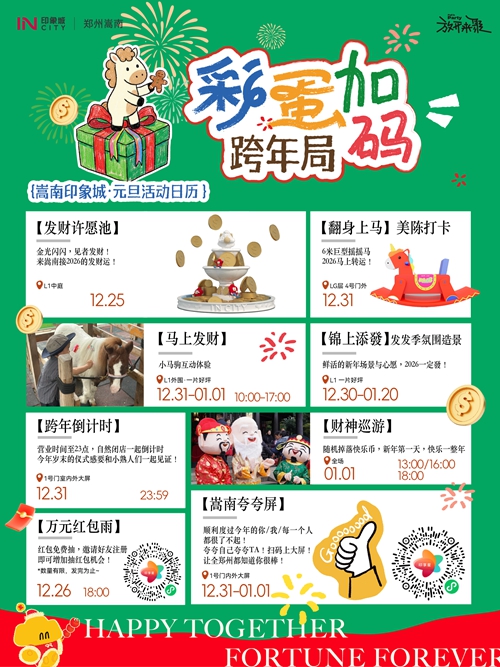 12月31日-1月3日,憑快樂幣可免費(fèi)騎小馬、抽獎、兌換零食禮包,輕松實(shí)現(xiàn)童趣與味蕾雙重滿足。跨年夜,商場營業(yè)時間延長至23:00后自然閉店,大屏同步跨年倒計(jì)時,和親友一起在歡呼聲中迎接2026,氛圍感直接拉滿!
