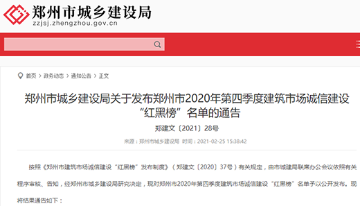 2月25日,鄭州市城鄉(xiāng)建設(shè)局發(fā)布鄭州市2020年第四季度建筑市場(chǎng)誠信建設(shè)“紅黑榜”名單的通告(鄭建文〔2021〕28號(hào)),鄭州地產(chǎn)集團(tuán)投資管理有限公司榮登“紅榜”單位,趙玨榮登“紅榜”個(gè)人。